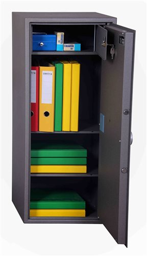 Nábytkový sejf ZSL 100díky svému nadstandardnímu objemu vhodně uschová Vaše dokumenty, cennosti nebo hotovost. Zároveň je také vhodný pro uložení krátkých zbraní a střeliva díky certifikátu získanému ve státem akreditované zkušebně.Uvnitř sejfu jsou dvě vyjímatelné a výškově stavitelné police a jedna uzamykatelná schránka.Užitná výška vnitřní uzamykatelné schránky je 14 cm. Rozměr dvířek vnitřní uzamykatelné schránky je 10,5×32 cm. Sejf je osazen elektronickým zámkem a trezorovým zámkem na klíč (součástí jsou 2ks klíčů, tento zámek slouží především k nouzovému otevírání).Vzhledem k velikosti a hmotnosti je samozřejmě velmi důležité sejf řádně ukotvit.Kotevní otvory jsou připraveny jak v zadní stěně, tak do spodní strany sejfu(průměr otvorů 10mm). Základním barevným provedením je granit/bronze.